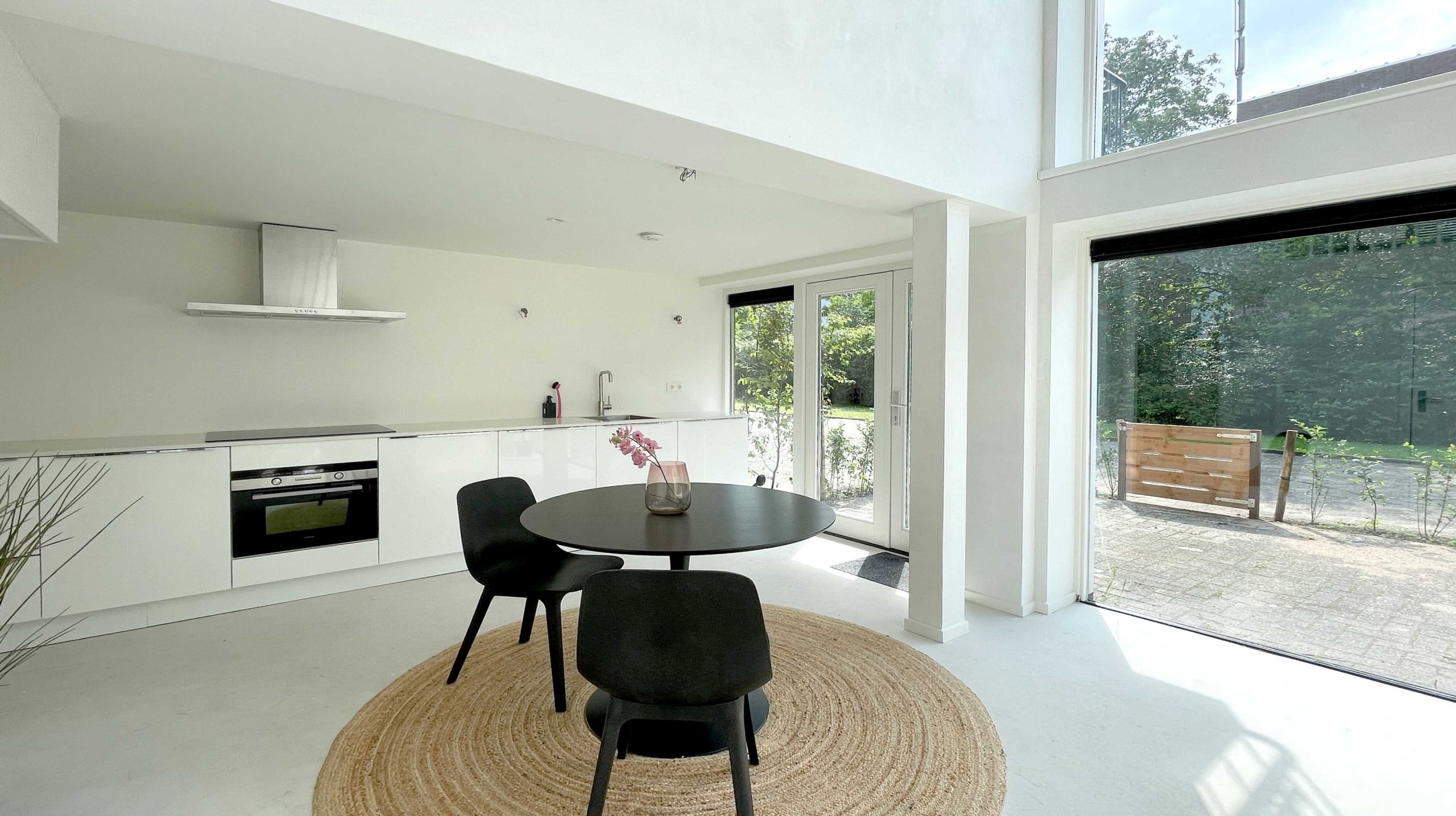 De garageboxen zijn getransformeerd tot leefkeuken en extra slaapkamer. De vide en grote puien geven de lage ruimte een open karakter en verbinden bestaand en nieuw aan elkaar.