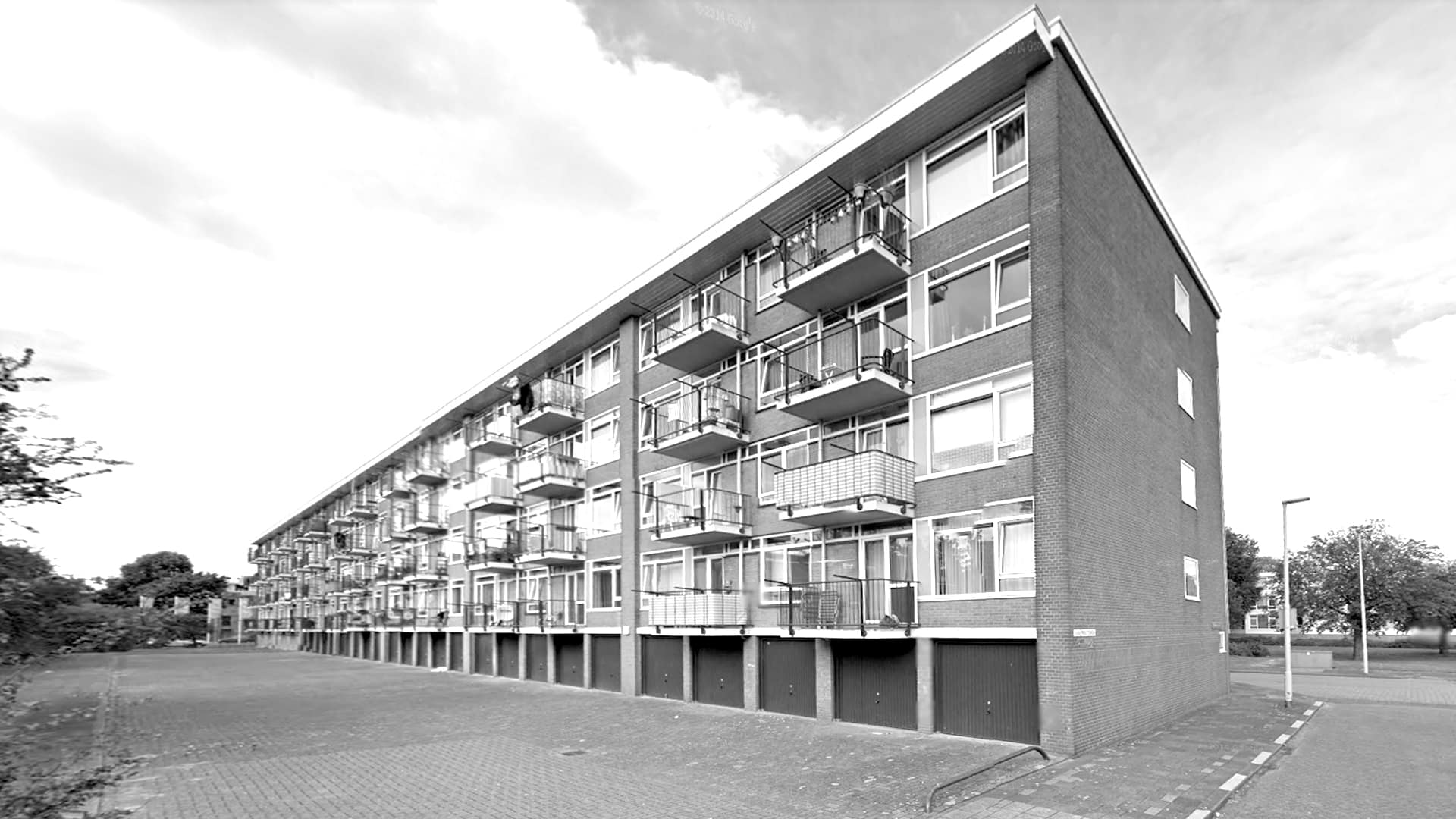 Bestaande achtergevel: garageboxen en bestrating.